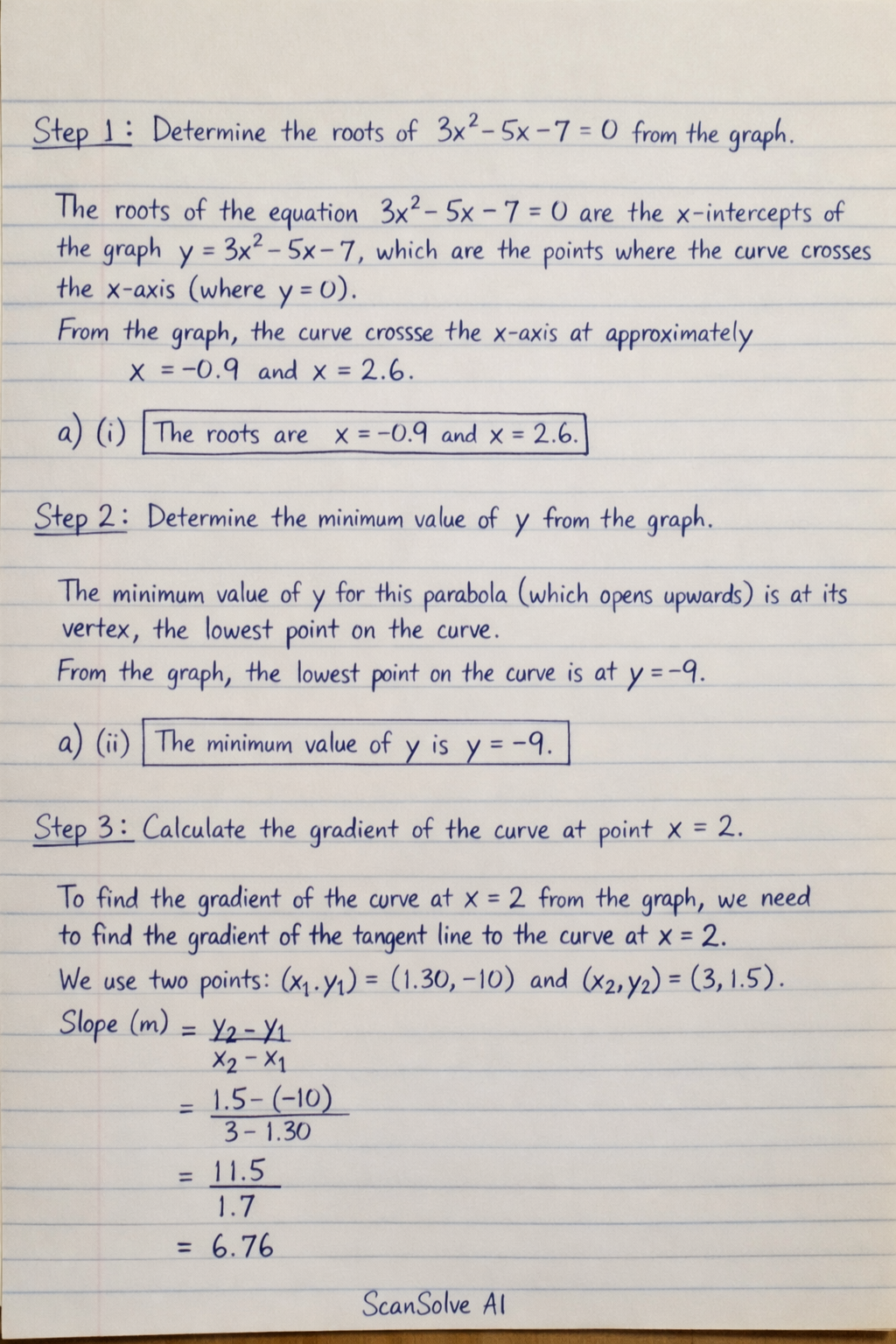 Step 1: Determine the roots of 3x2−5x−7=0 from the graph.