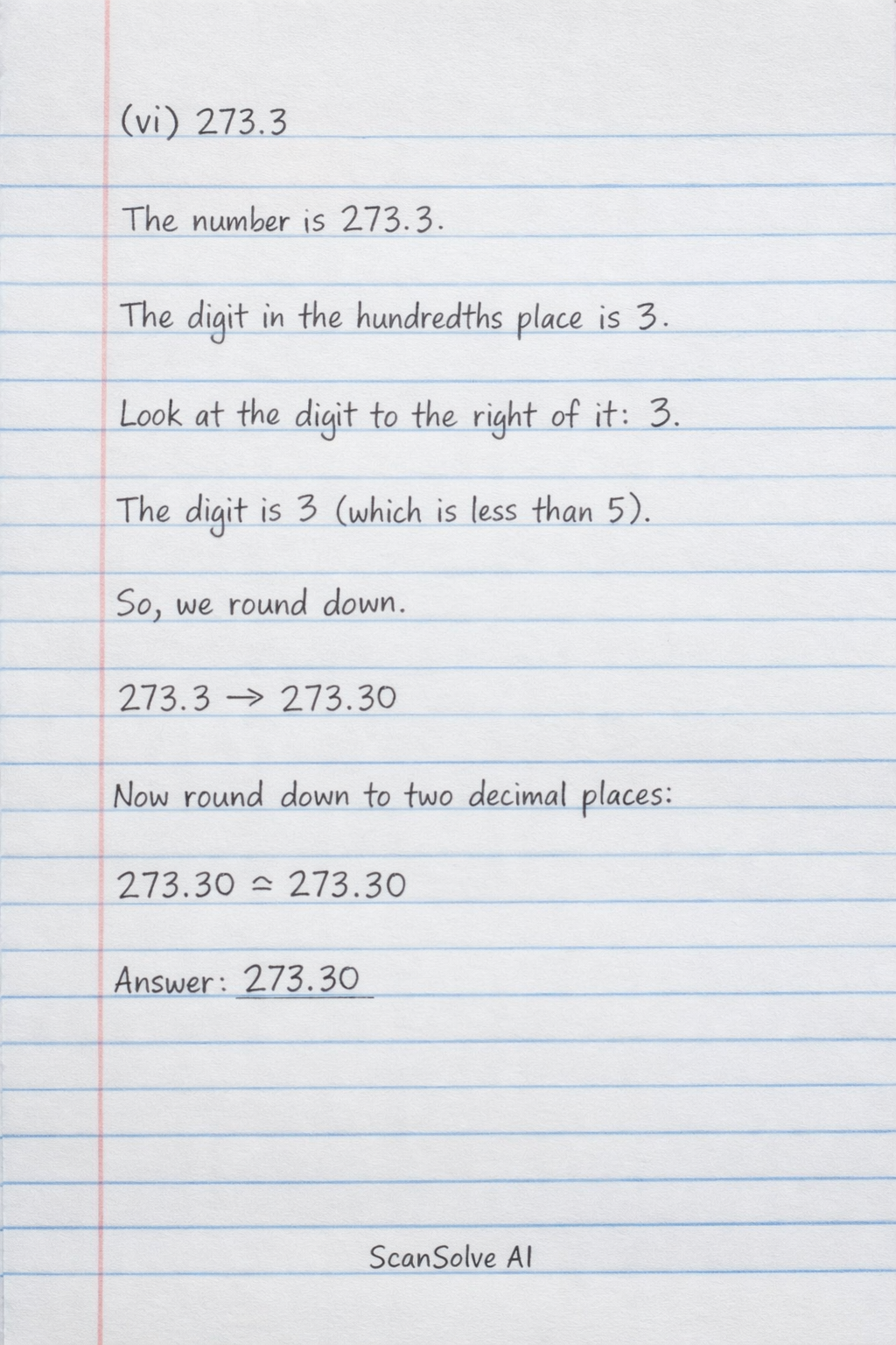 Here are the solutions to the problems: 3. Round off each of the following to the nearest 'hundredths' (two decimal places): (i) 5.345 ≈ 5.35 (ii) 66.218 ≈ 66.22 (iii) 37.444 ≈ 37.44 (iv) 85.837 ≈ 85.84 (v) 154.485 ≈ 154.49 (vi) $273.3
