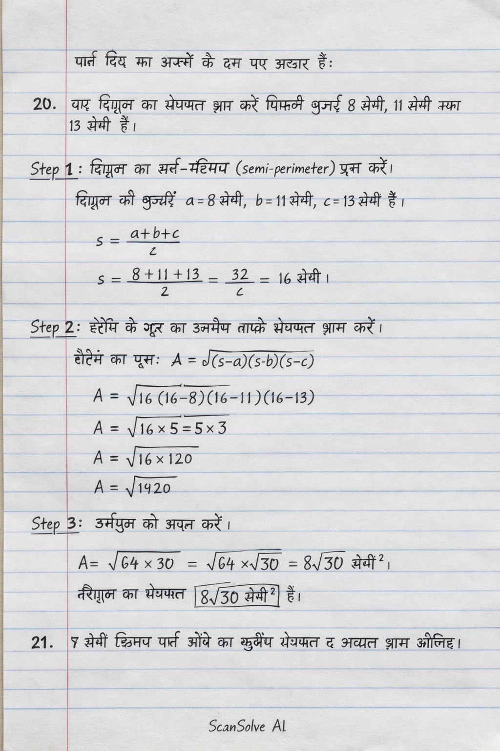 20. एक त्रिभुज का क्षेत्रफल ज्ञात करें जिसकी भुजाएँ 8 सेमी, 11 सेमी तथा 13 सेमी हैं।