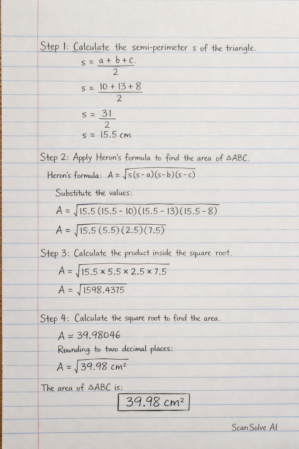 Calculate the semi-perimeter s of the triangle. The side lengths are a = 10 cm, b = 13 cm, and c = 8 cm.