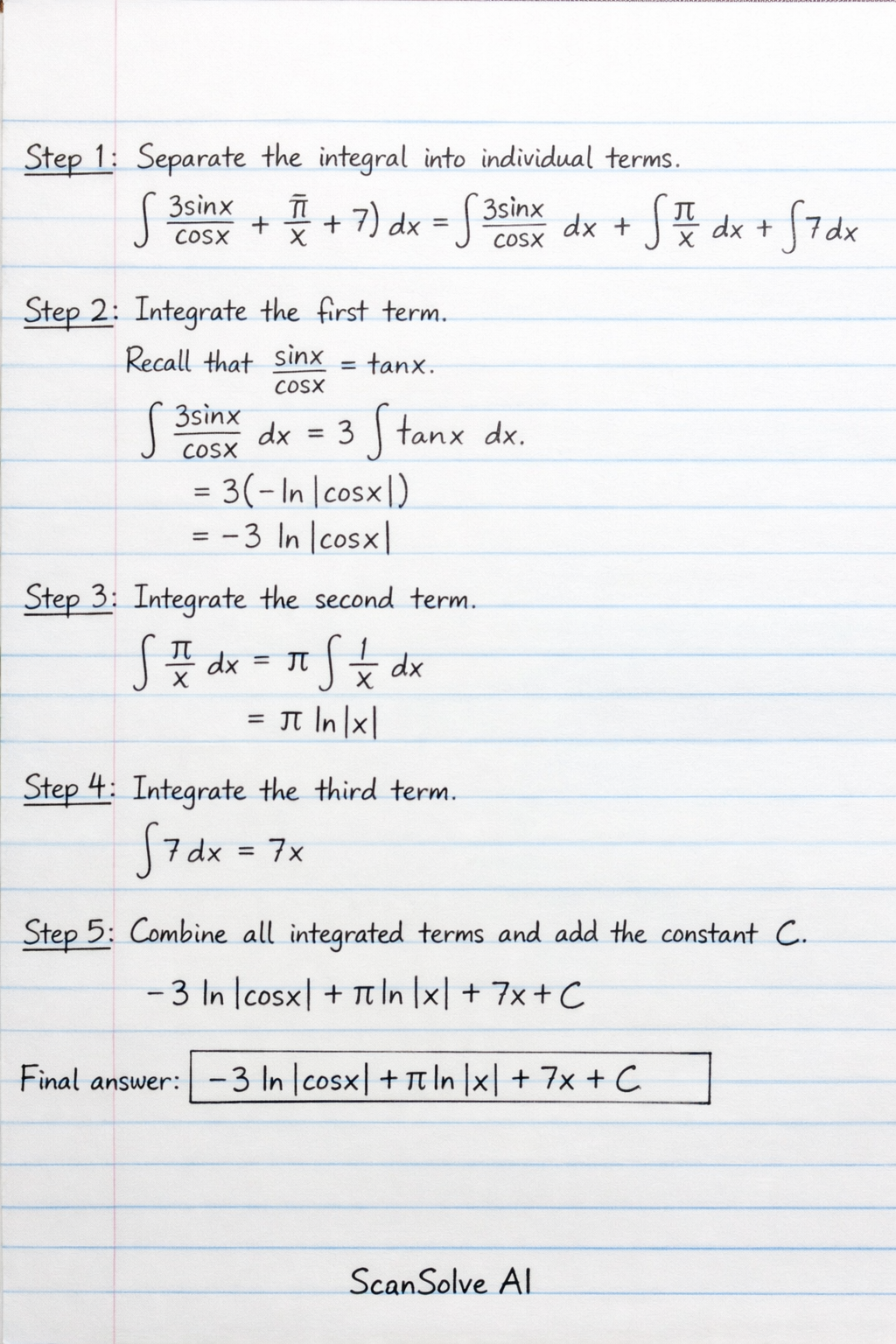 The final answer is −3ln∣cosx∣+πln∣x∣+7x+C.