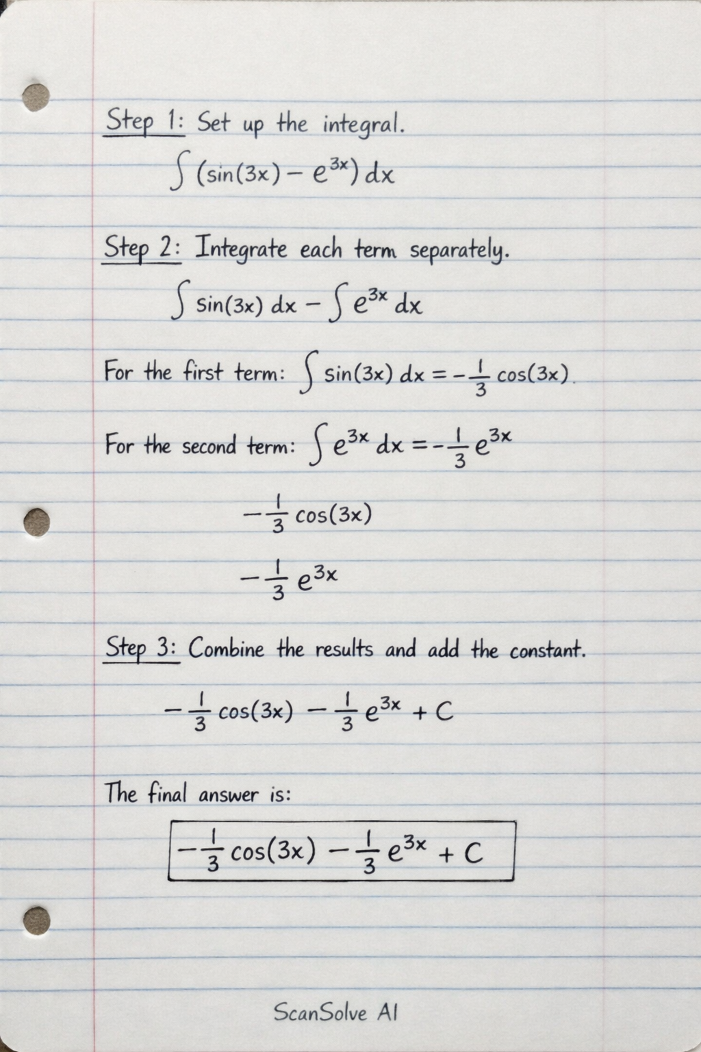 We need to integrate sin(3x)−e3x with respect to x.