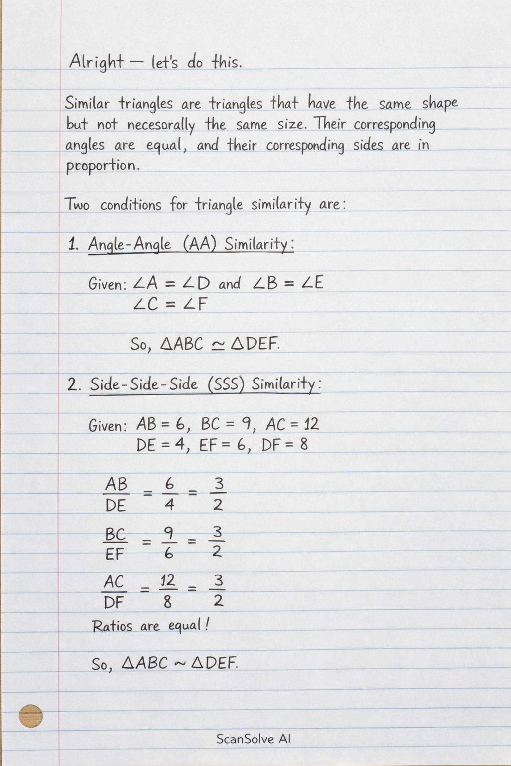 Similar triangles are triangles that have the same shape but not necessarily the same size. Their corresponding angles are equal, and their corresponding sides are in proportion.