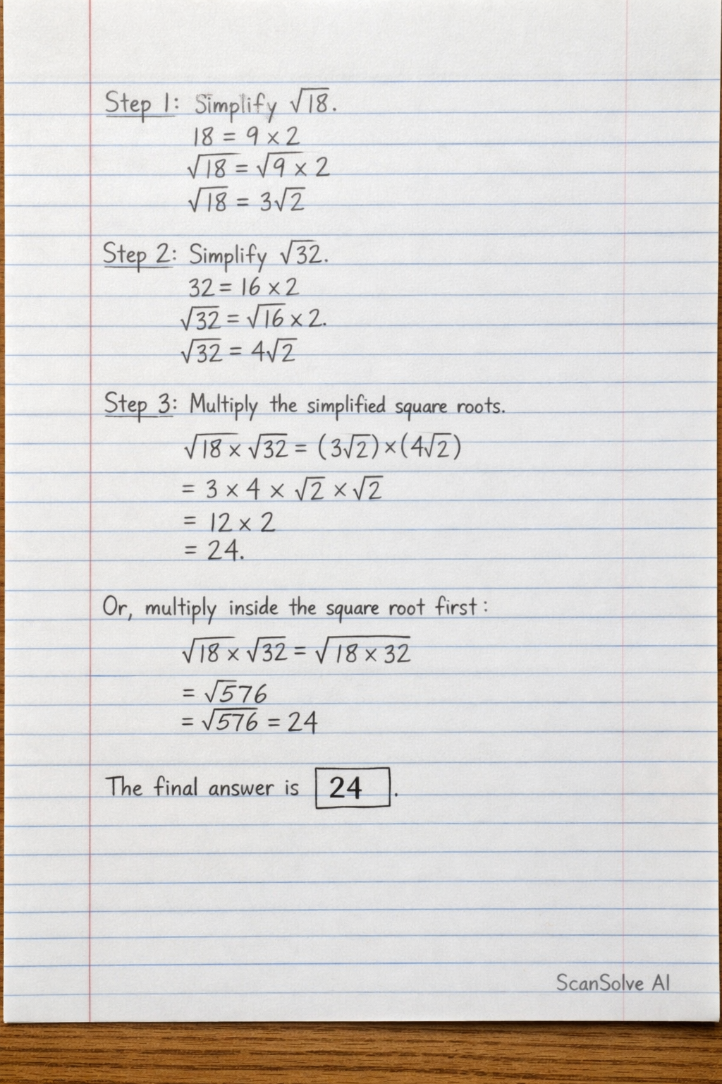 \sqrt{18} \times \sqrt{32} = (3\sqrt{2}) \times (4\sqrt{2})