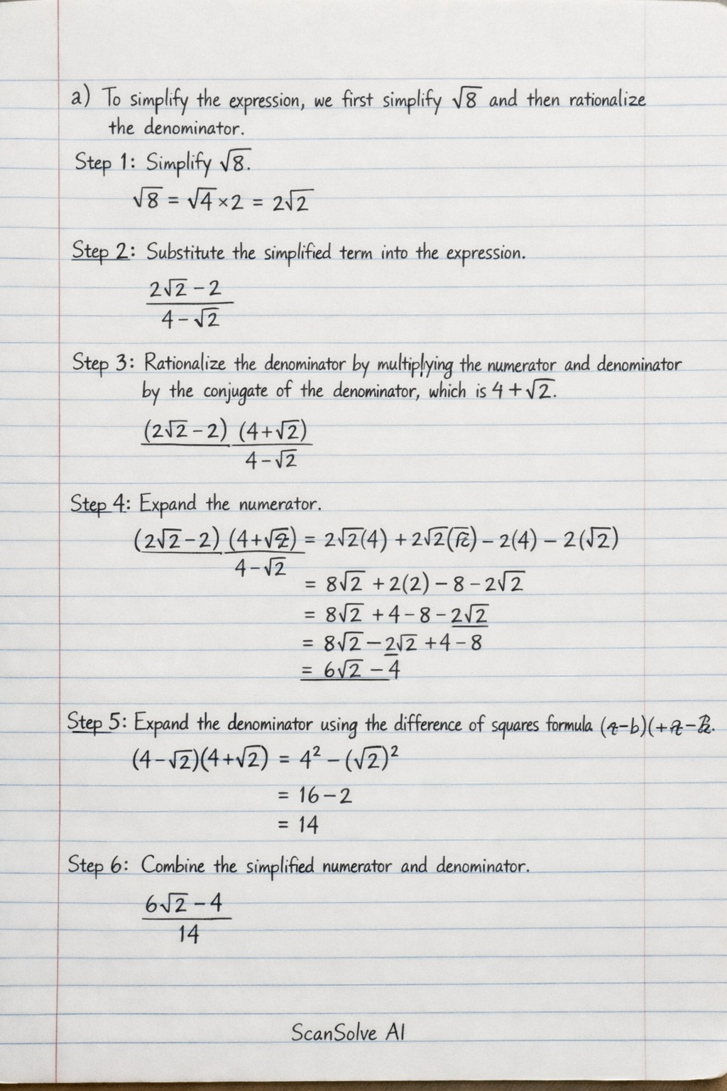Fresh day More, let's solve. a) To simplify the expression, we first simplify sqrt(8) and then rationalize the denominator.