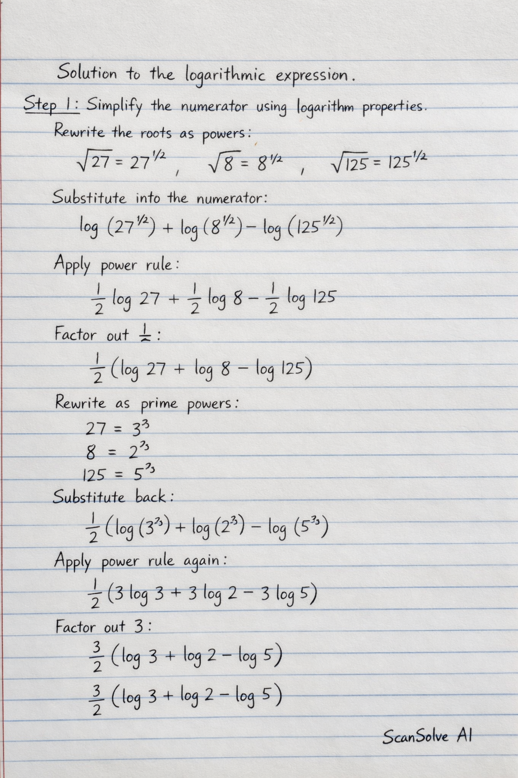 $$\frac{3}{2} (\log 3 + \log 2 - \log 5)$$