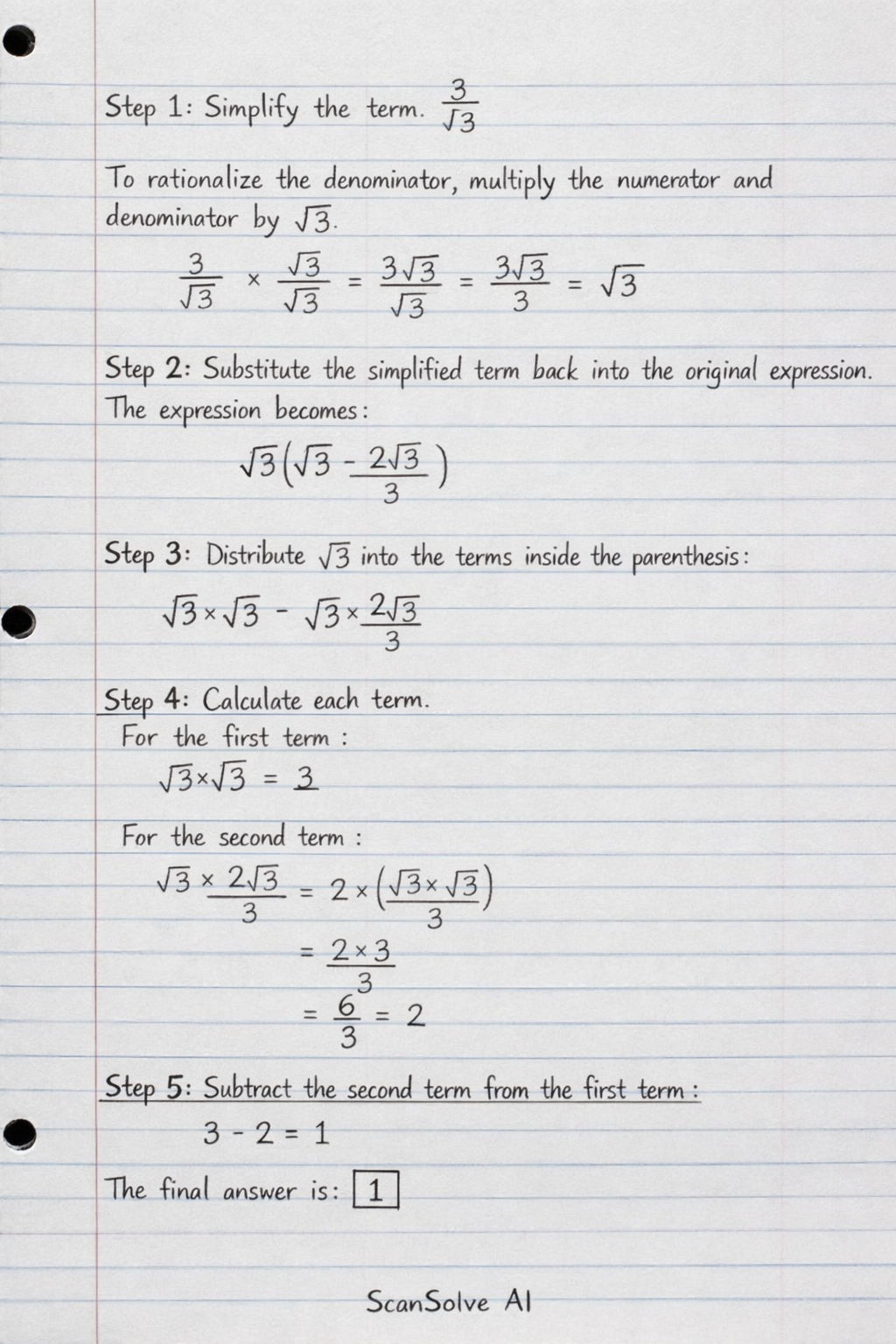 $$ \sqrt{3} \left( \sqrt{3} - \frac{2\sqrt{3}}{3} \right) $$