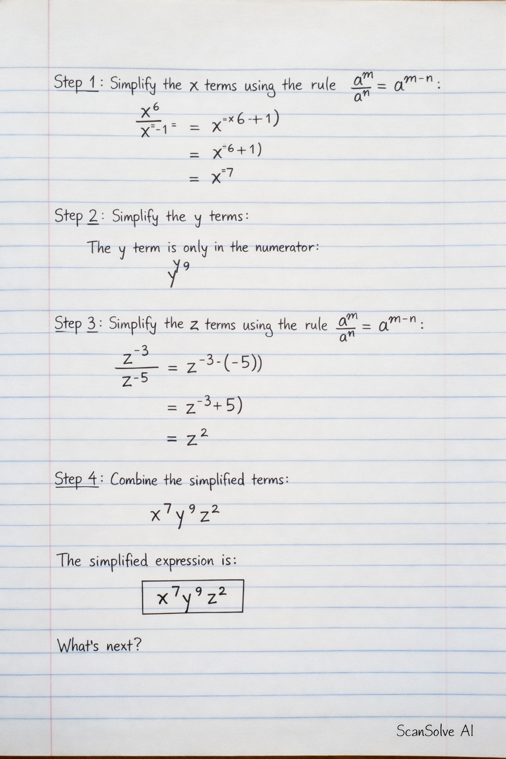 Simplify the x terms using the rule (a^m)/(a^n) = a^m-n.