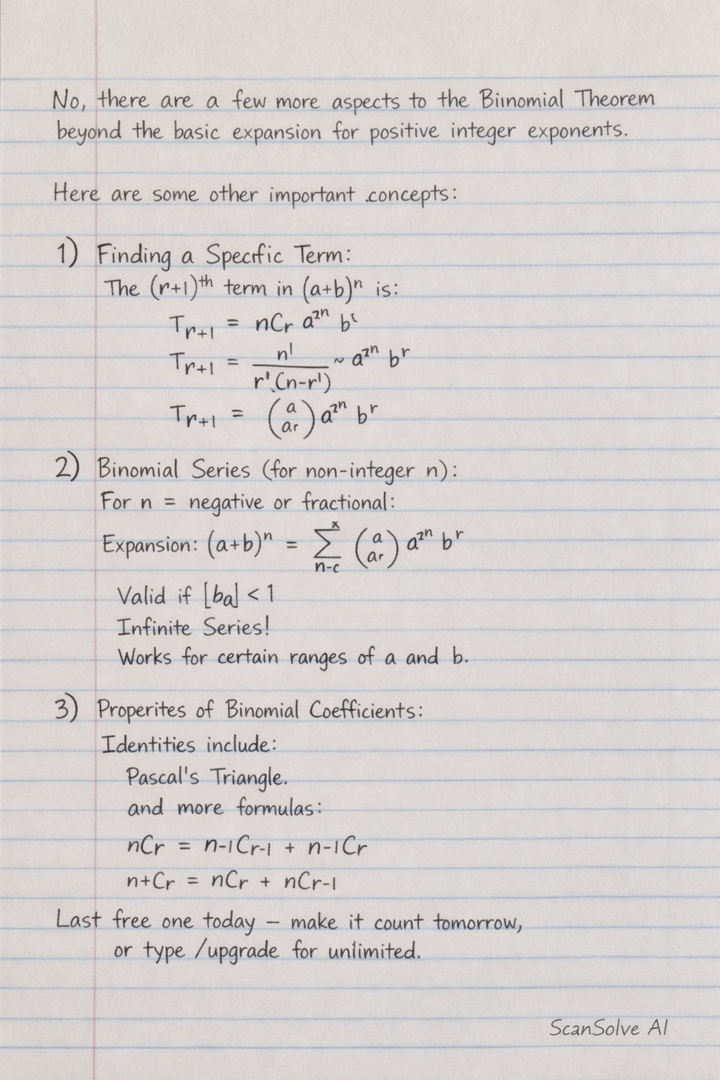 • Binomial Series (for non-integer exponents): The theorem can be extended to cases where n is a negative integer or a fraction. In these cases, the expansion results in an infinite series, and it's valid only for certain ranges of a and b (e.g., ∣b/a∣<1).