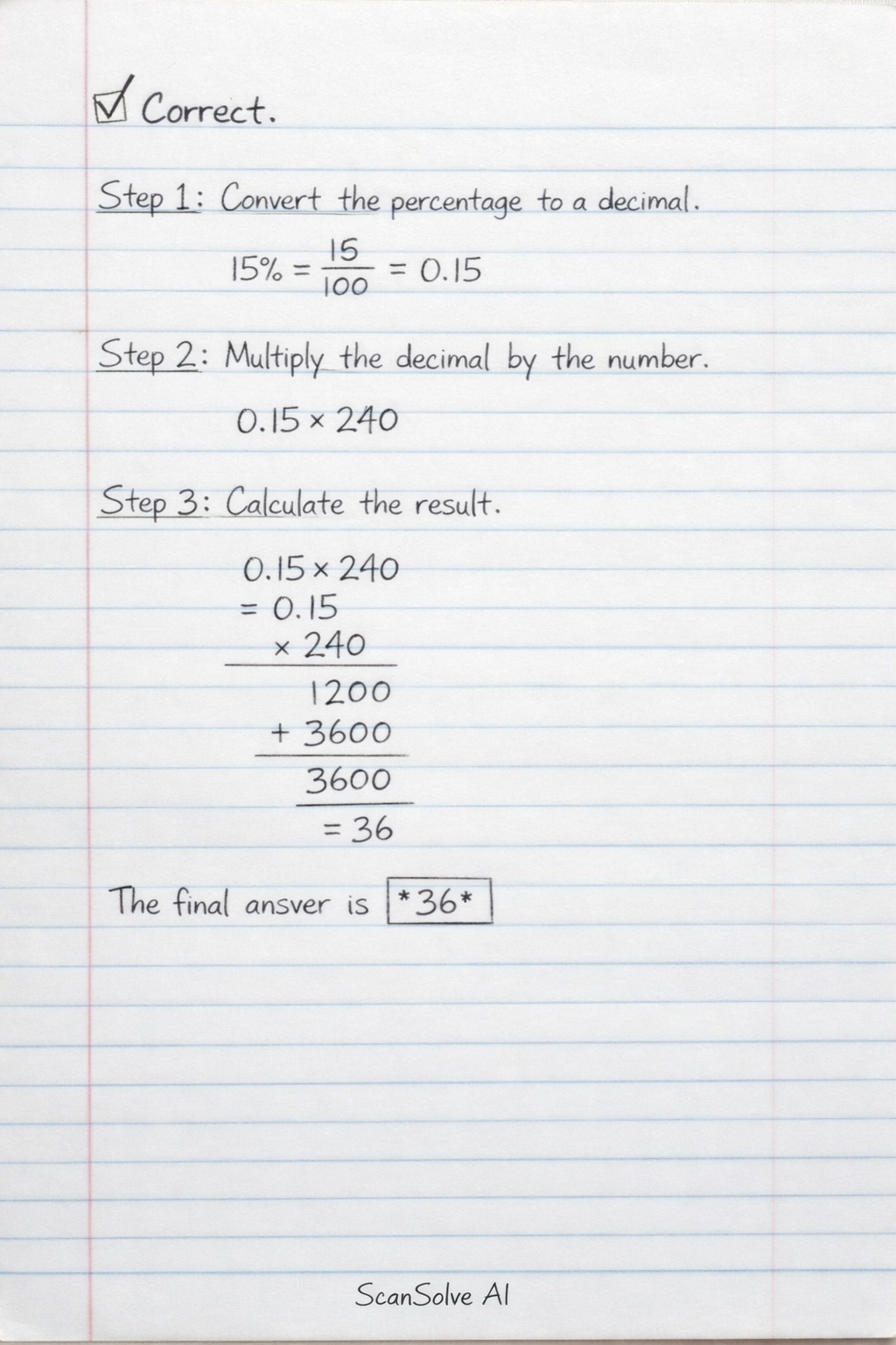 Step 1: Convert the percentage to a decimal. 15\% = (15)/(100) = 0.15 Step 2: Multiply the decimal by the number. 0.15 x 240 Step 3: Calculate the result. 0.15 x 240 = 36 36