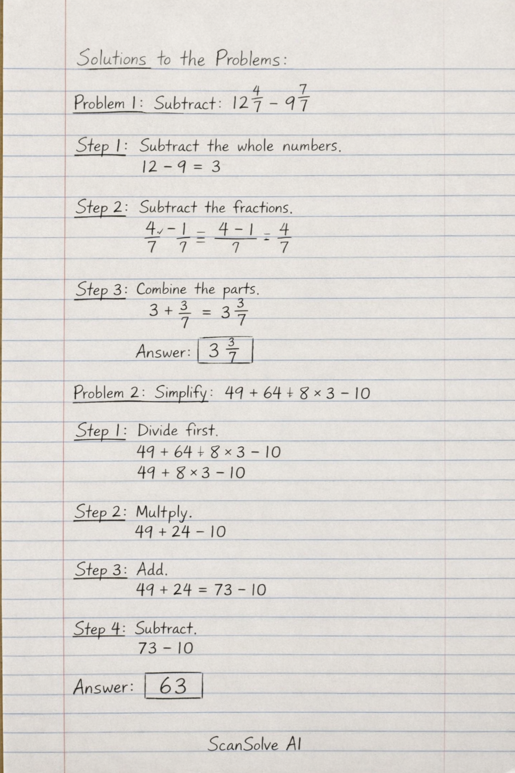 Problem 2: Simplify: 49+64÷8×3−10
