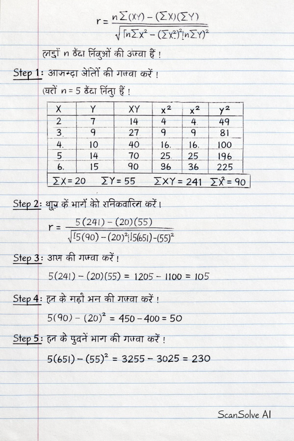 Step 7: गुणांक सहसंबंध ($r$) की गणना करें।