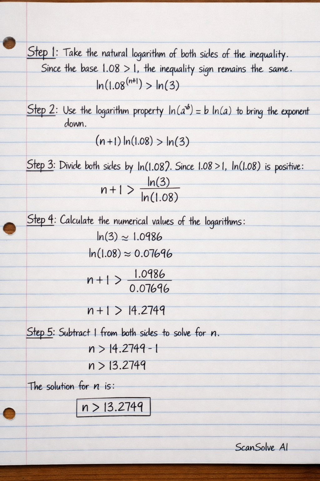 Step 3: Divide both sides by ln(1.08). Since 1.08>1, ln(1.08) is positive, so the inequality sign remains the same.