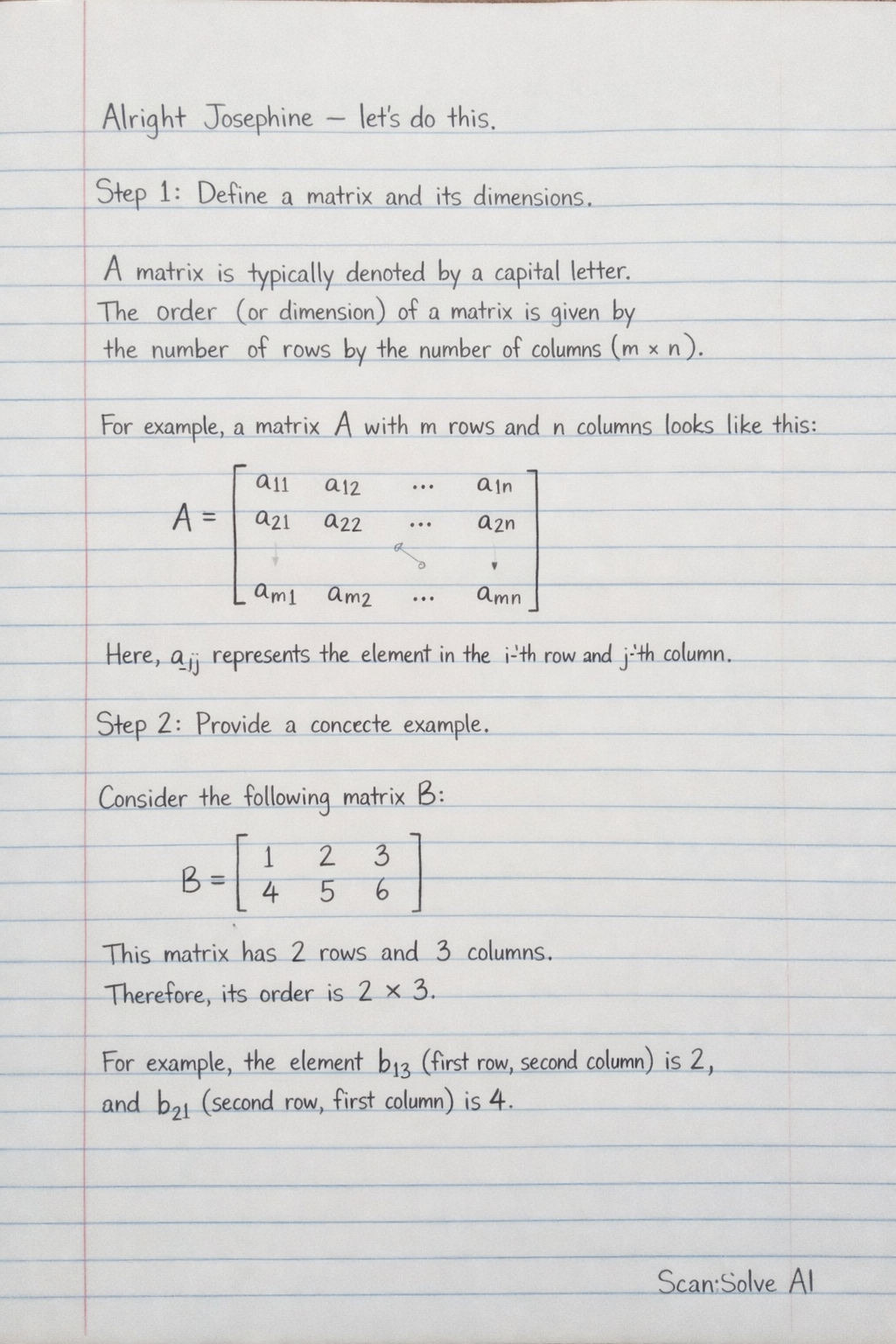 a_{11} & a_{12} & \cdots & a_{1n} \\ a_{21} & a_{22} & \cdots & a_{2n} \\ \vdots & \vdots & \ddots & \vdots \\ a_{m1} & a_{m2} & \cdots & a_{mn} \end{bmatrix} $$ Here, $a_{ij}$ represents the element in the $i$-th row and $j$-th column. Step 2: Provide a concrete example. Consider the following matrix $B$: $$ B = \begin{bmatrix} 1 & 2 & 3 \\ 4 & 5 & 6 \end{bmatrix} $$ This matrix has 2 rows and 3 columns. Therefore, its order is $2 \times 3$. For example, the element $a_{12}$ (first row, second column) is 2, and $a_{21}$ (second row, first column) is 4. What's next? Send 'em 📸Get instant step-by-step solutions to any question. Free to start.