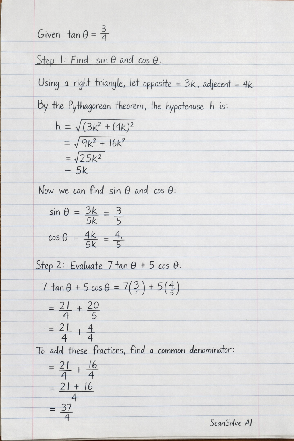 $$7 \tan \theta + 5 \cos \theta = 7 \left(\frac{3}{4}\right) + 5 \left(\frac{4}{5}\right)$$