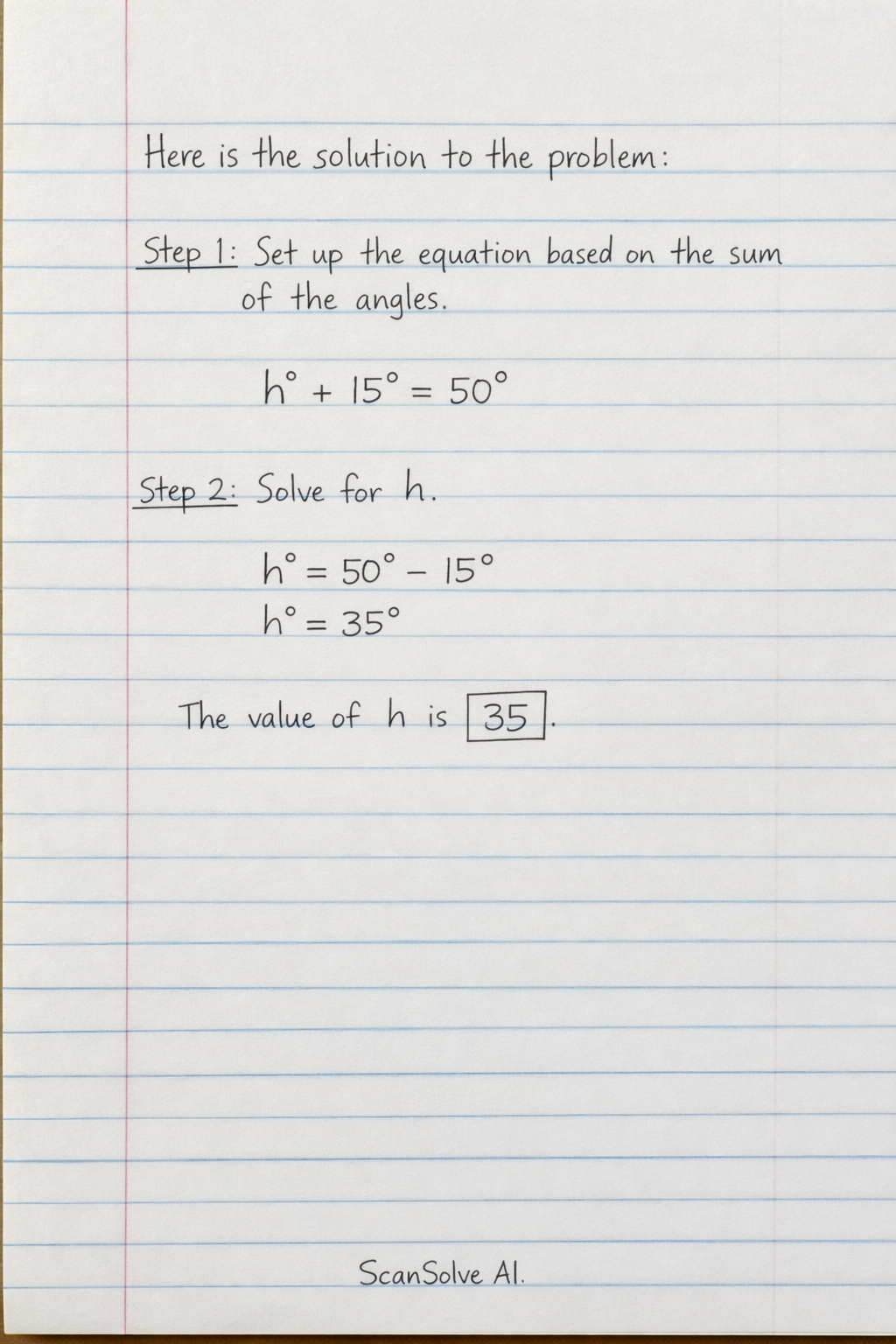 The combined angle measure is 50^. The two given angles are h^ and 15^.