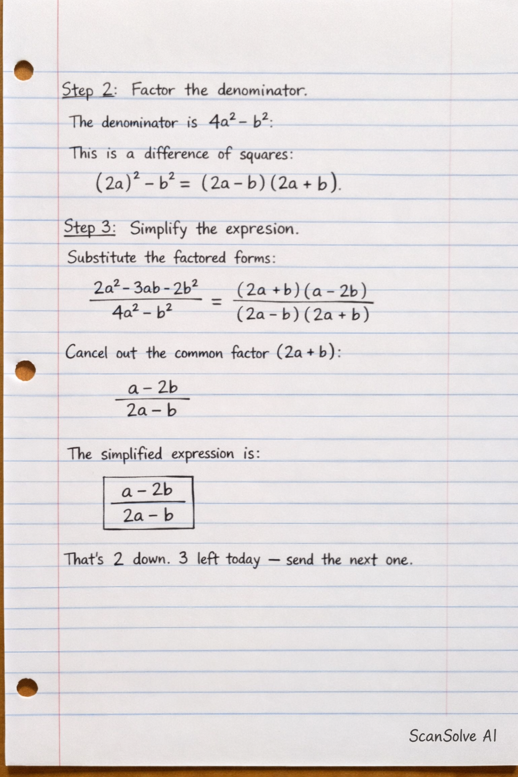 Step 3: Simplify the expression. Substitute the factored forms of the numerator and denominator back into the expression: Cancel out the common factor : The simplified expression is .