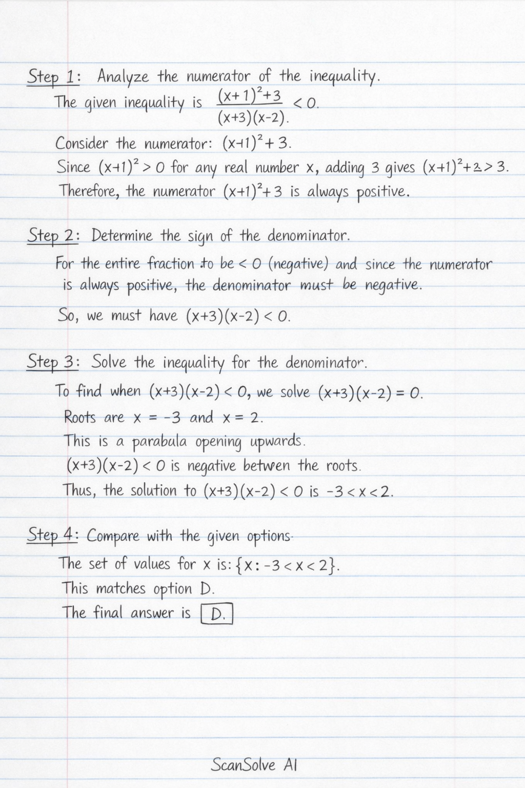 This is a parabola opening upwards. The expression (x+3)(x−2) will be negative when x is between its roots.