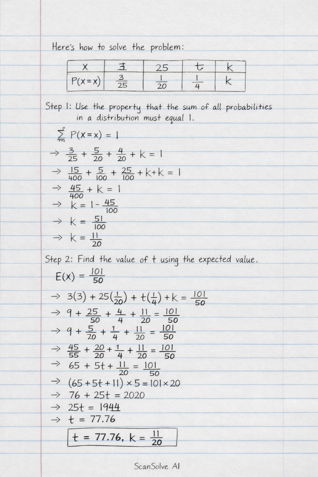 The given probability distribution table is: