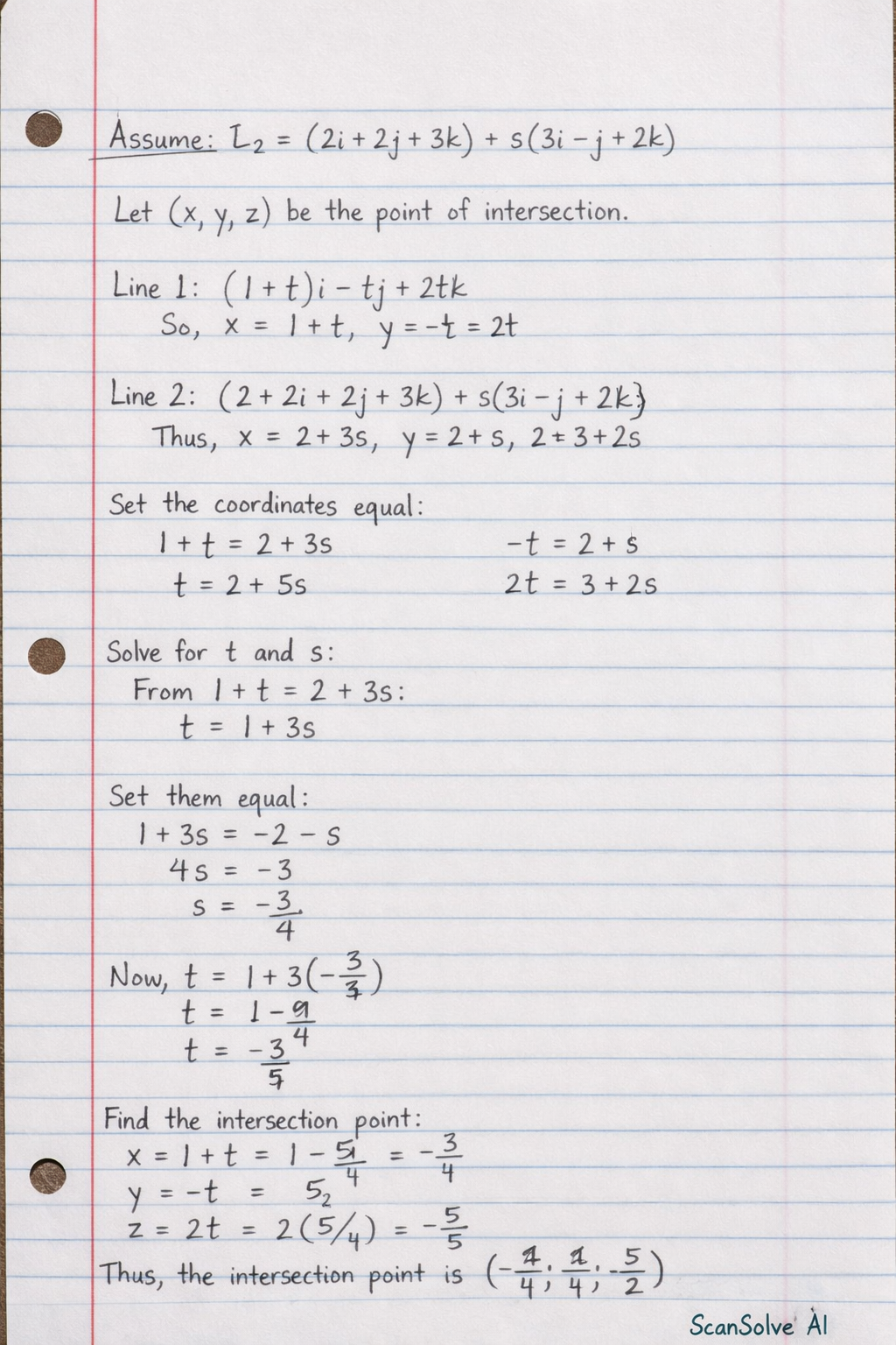 The image provided is blurry, making it difficult to read the exact coefficients for the vector equations. The question asks to "Show that L1 and L2 intersect", which implies they must intersect
