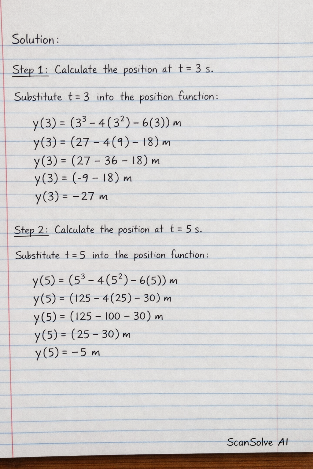 The position of the particle is given by y(t)=(t3−4t2−6t)m.