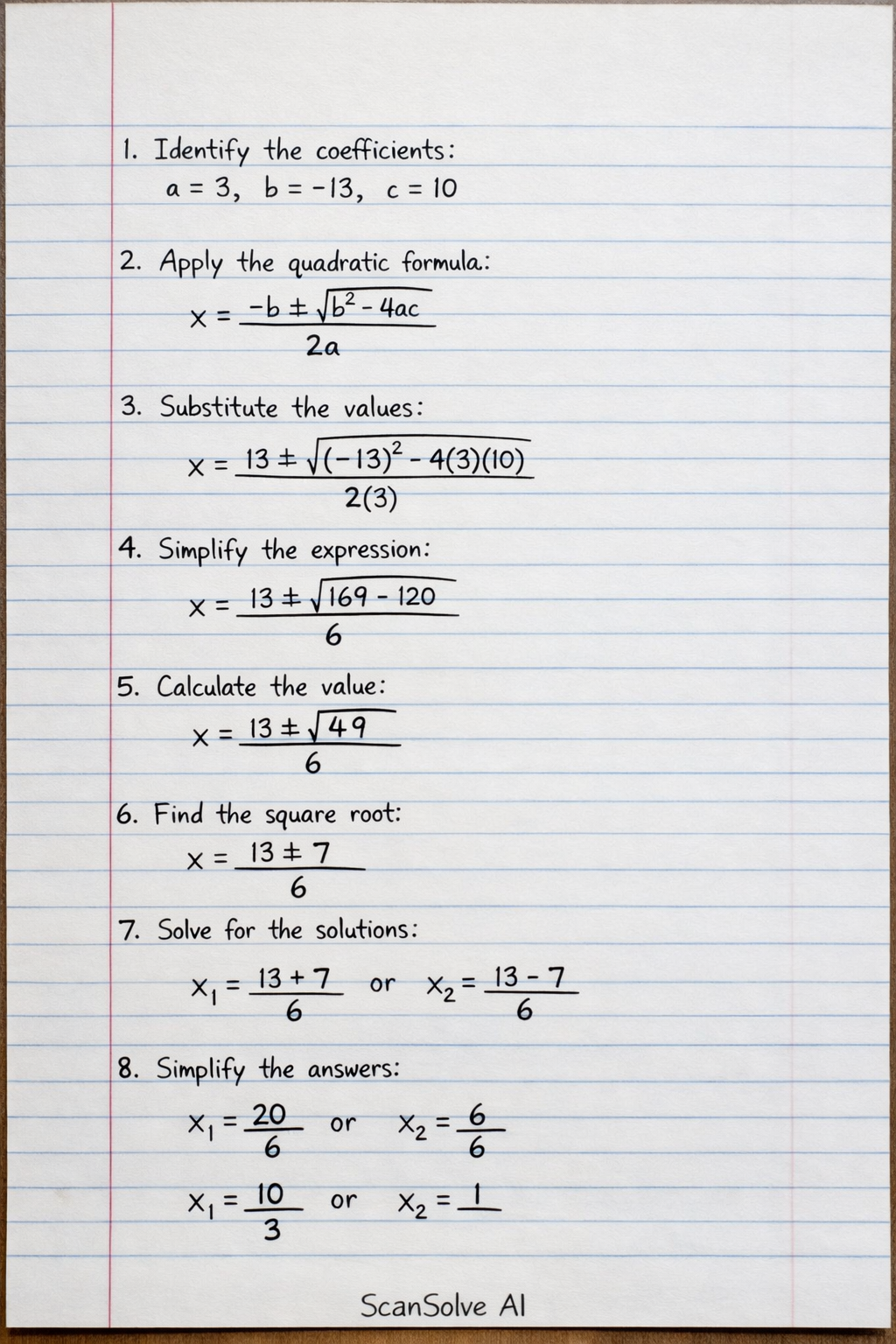 The problem involves solving a quadratic equation using the quadratic formula. Based on the student's work, the quadratic equation being solved is $3x^2 - 13x + 10 = 0$.
