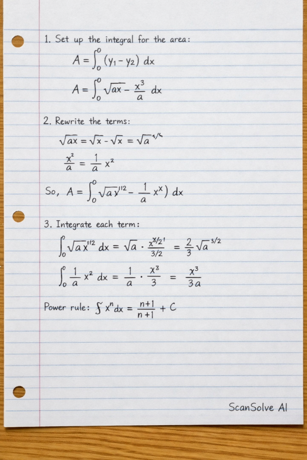 $$ A = \left[ \frac{2}{3} \sqrt{a} x^{3/2} - \frac{x^3}{3a} \right]_{0}^{a} $$