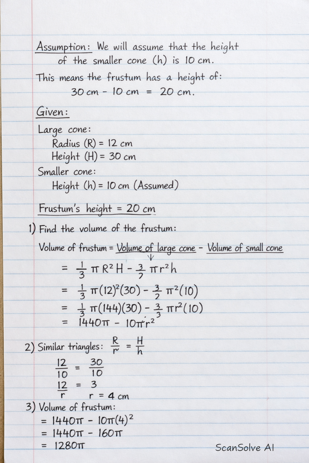 The problem statement "The smaller cone which is" is incomplete. To solve the problem, we must assume a dimension for the smaller cone. A common assumption in such problems is that the height of the s