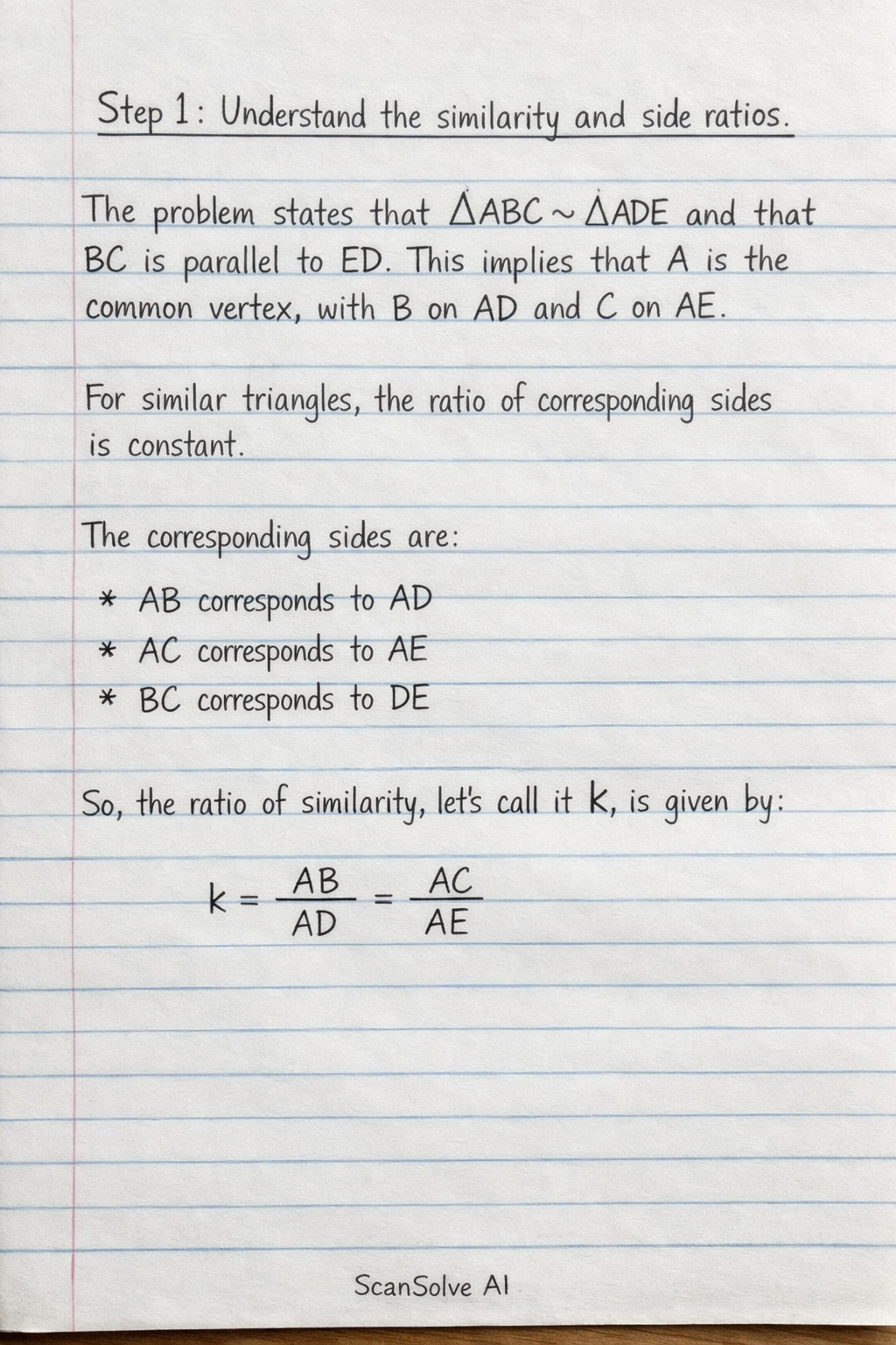 Understand the similarity and side ratios. The problem states that ABC is similar to ADE ( ABC ADE) and that BC is parallel to ED.