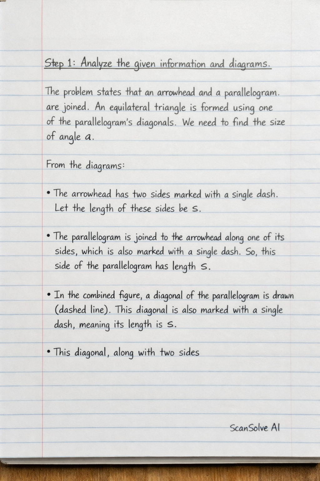 The problem states that an arrowhead and a parallelogram are joined. An equilateral triangle is formed using one of the parallelogram's diagonals. We need to find the size of angle a.