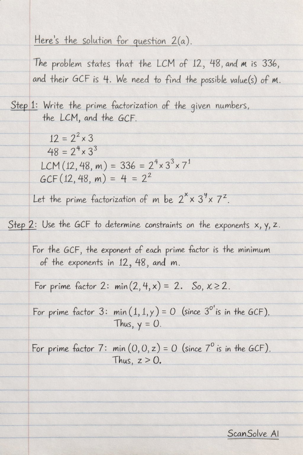 For prime factor 7: min(0,0,z)=0 (since 70 is in the GCF). This implies z≥0.