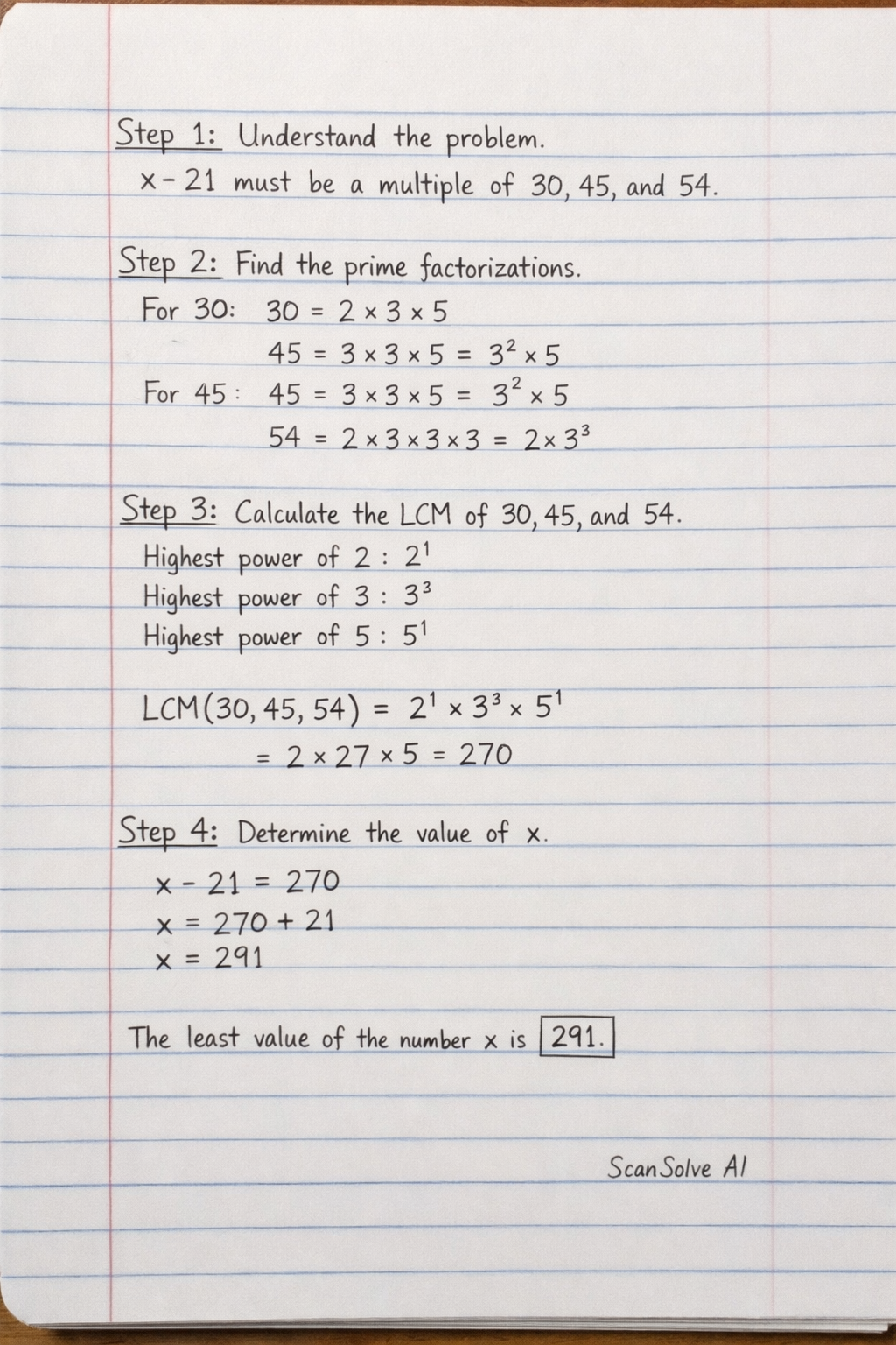 Step 3: Calculate the LCM of 30, 45, and 54.