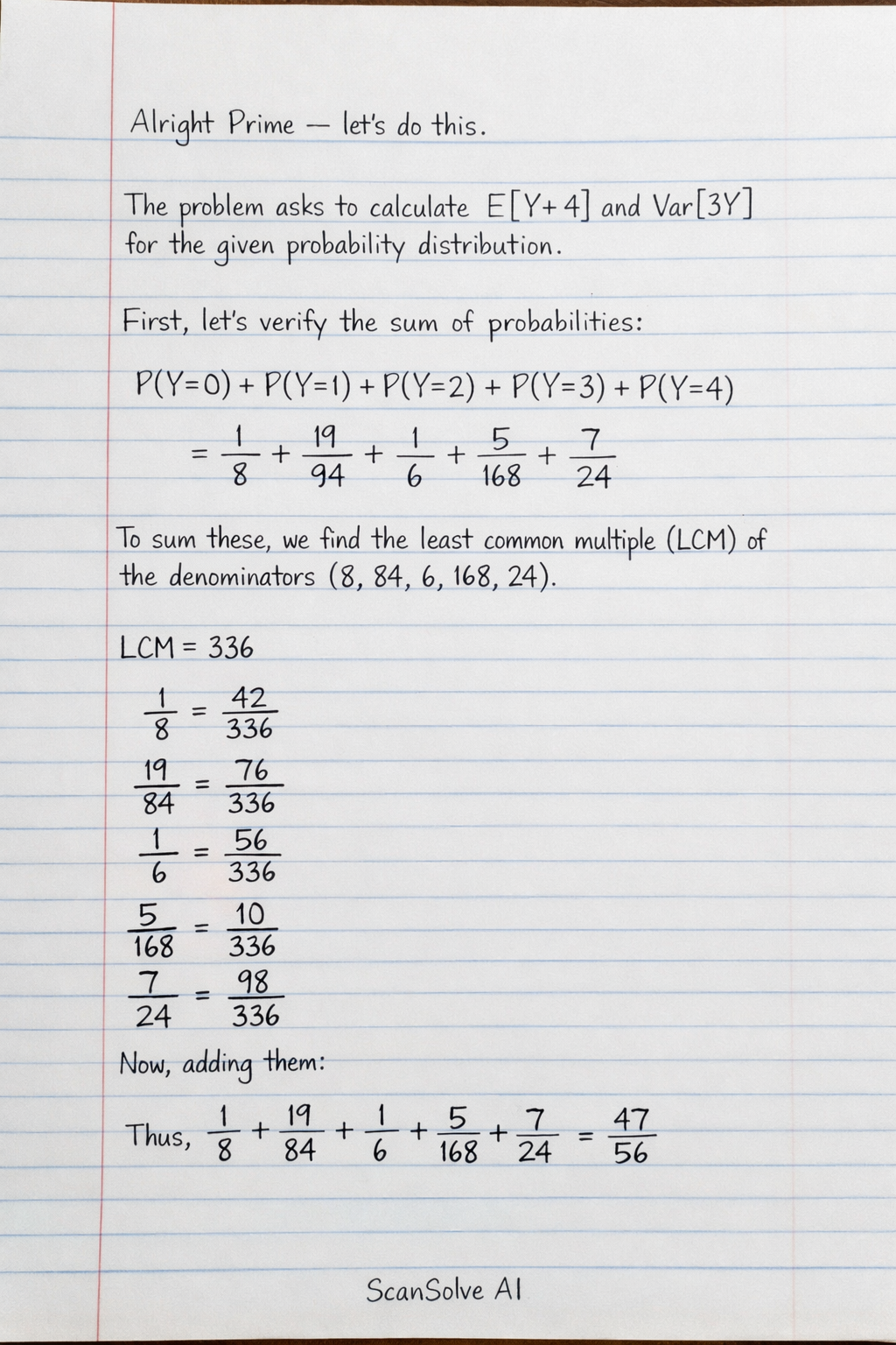 Alright Prime — let's do this. The problem asks to calculate E[Y+4] and Var[3Y] for the given probability distribution.