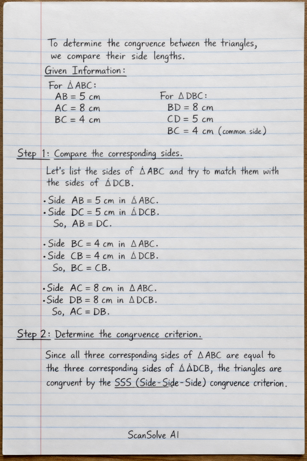 Since all three corresponding sides of △ABC are equal to the three corresponding sides of △DCB, the triangles are congruent by the SSS (Side-Side-Side) congruence criterion.