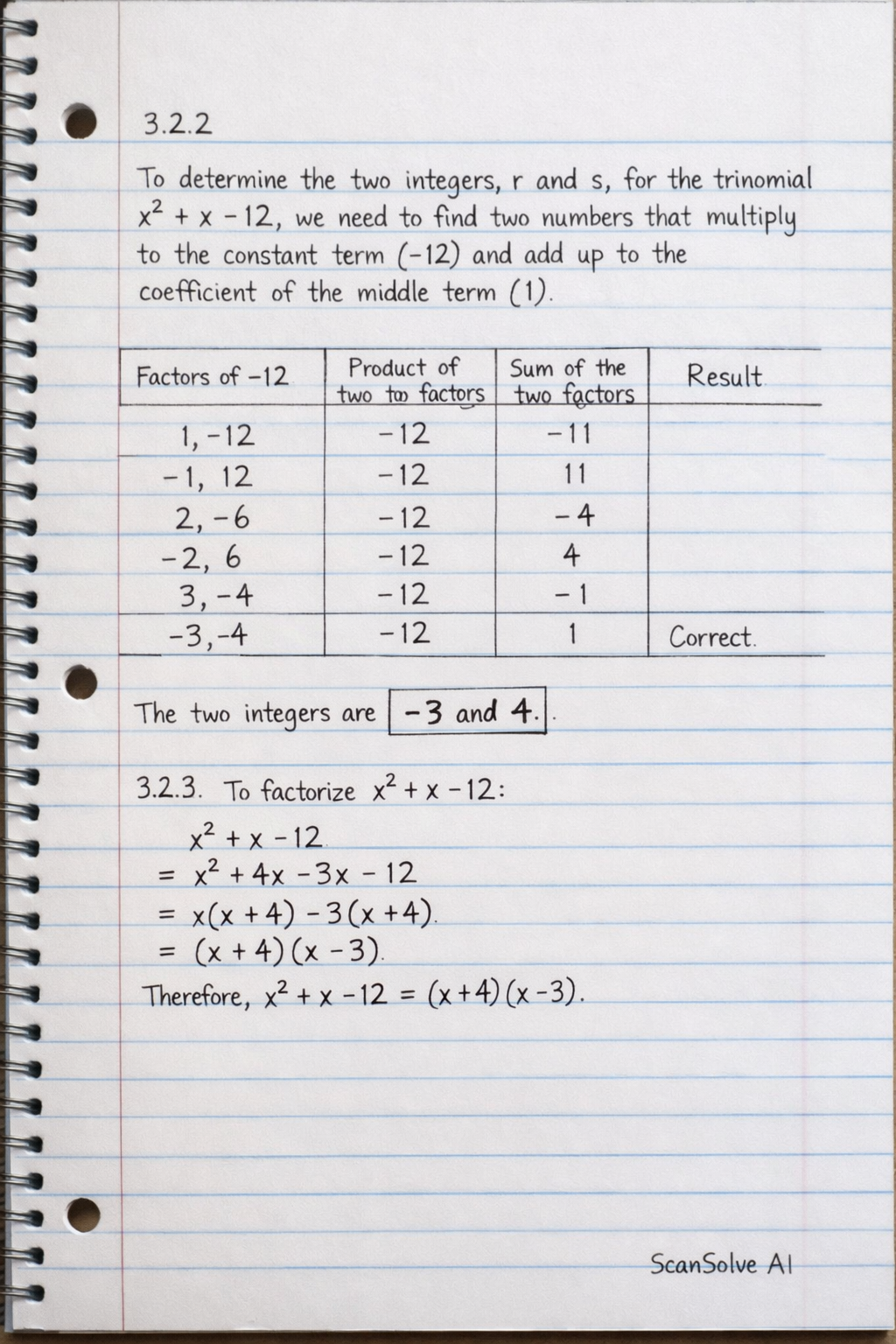 To determine the two integers, r and s, for the trinomial x2+x−12, we need to find two numbers that multiply to the constant term (−12) and add up to the coefficient of the middle term (1).