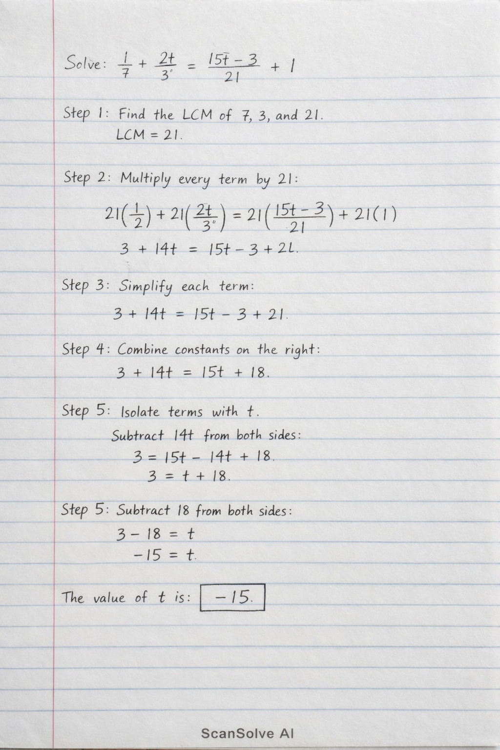 To determine the value of t in the given equation, we will first find a common denominator to clear the fractions.