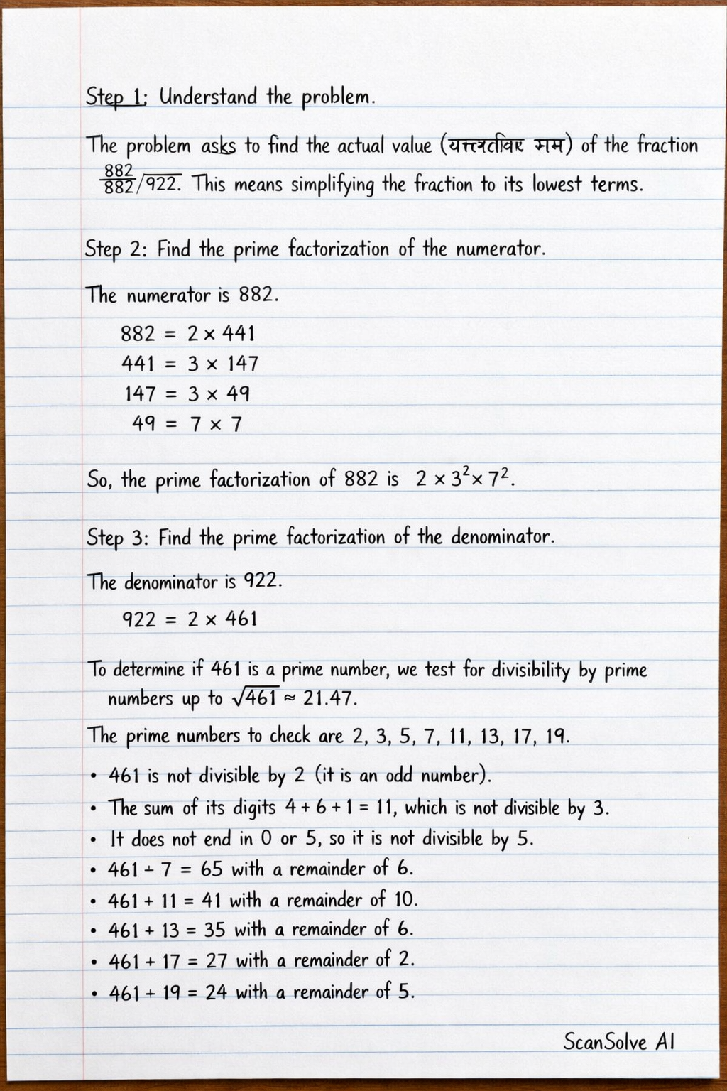 to find the actual value (वास्तविक मान) of the fraction (882)/(922). This means simplifying the fraction to its lowest terms.