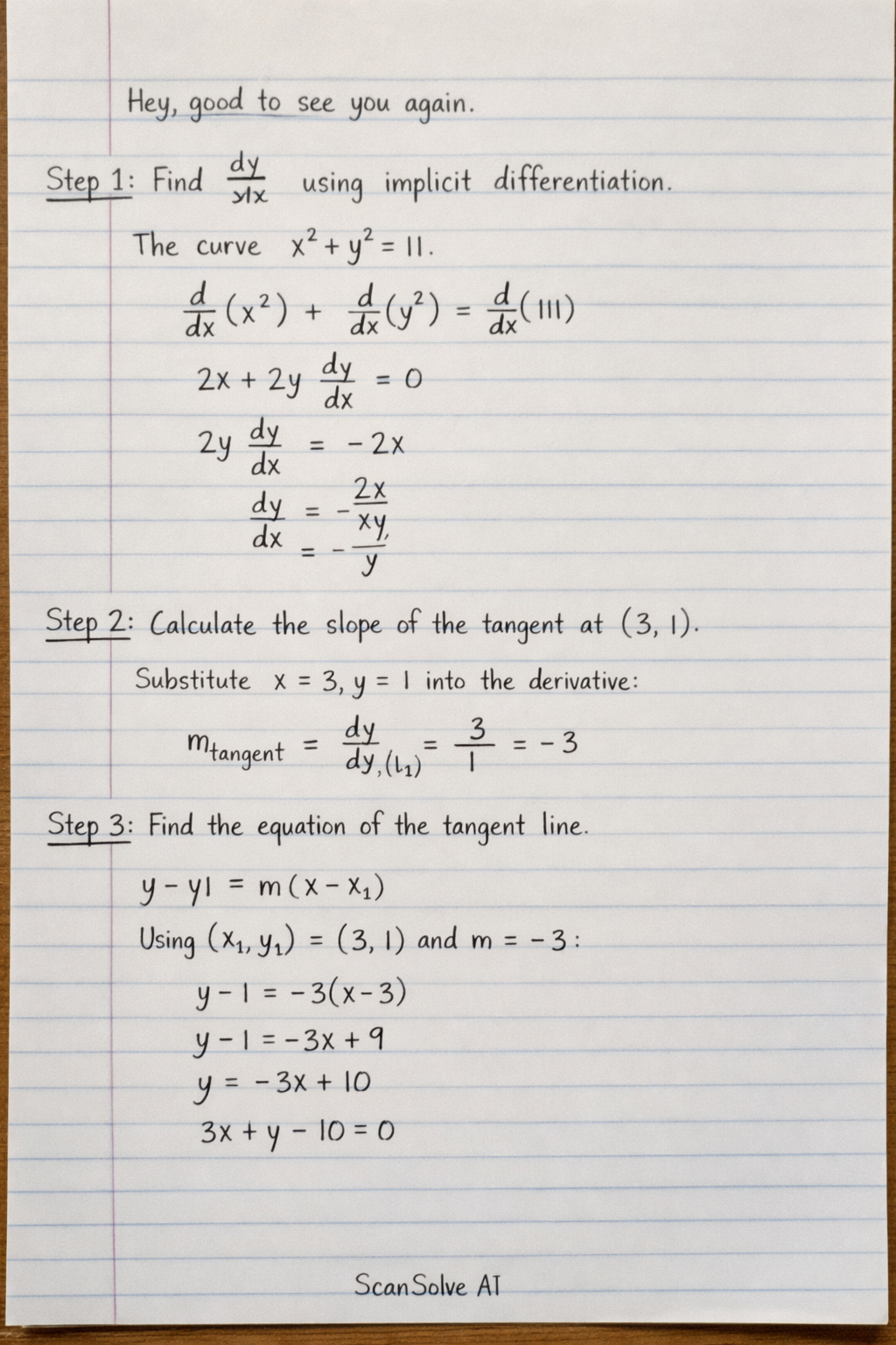 $$ m_{\text{tangent}} = \frac{dy}{dx} \Big|_{(3,1)} = -\frac{3}{1} = -3 $$