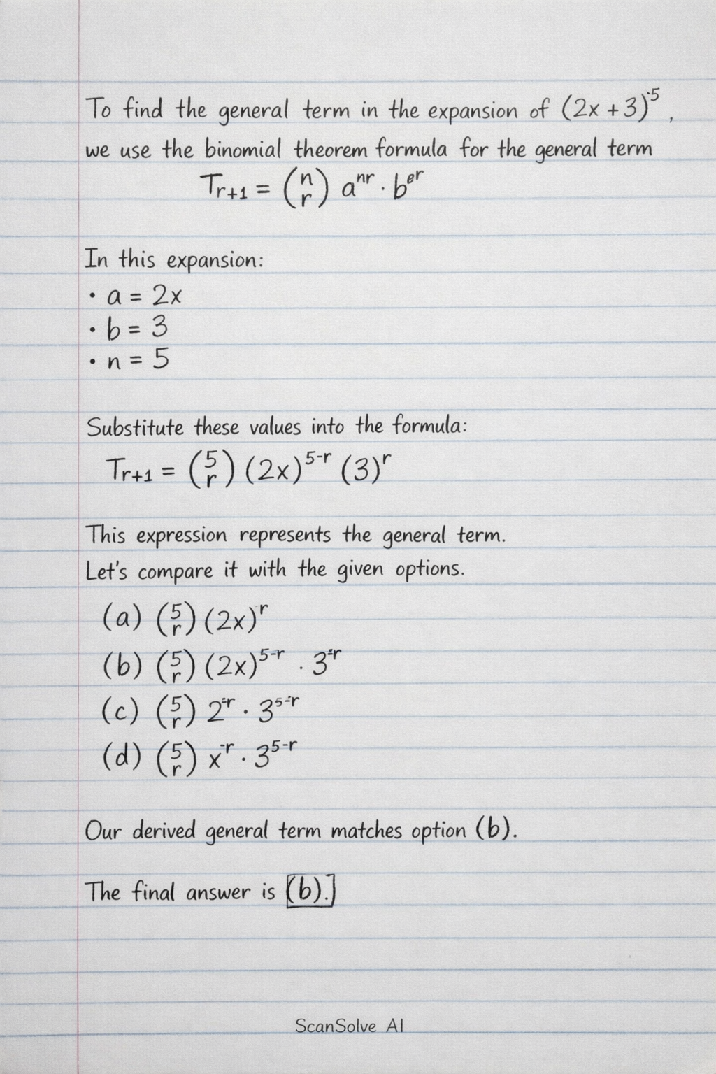 To find the general term in the expansion of (2x+3)5, we use the binomial theorem formula for the general term Tr+1 of (a+b)n: