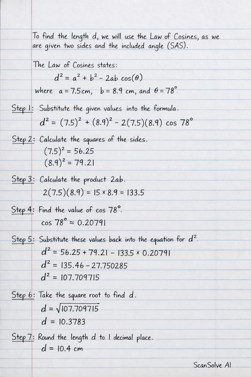 $$ d^2 = (7.5)^2 + (8.9)^2 - 2(7.5)(8.9) \cos(78^\circ) $$