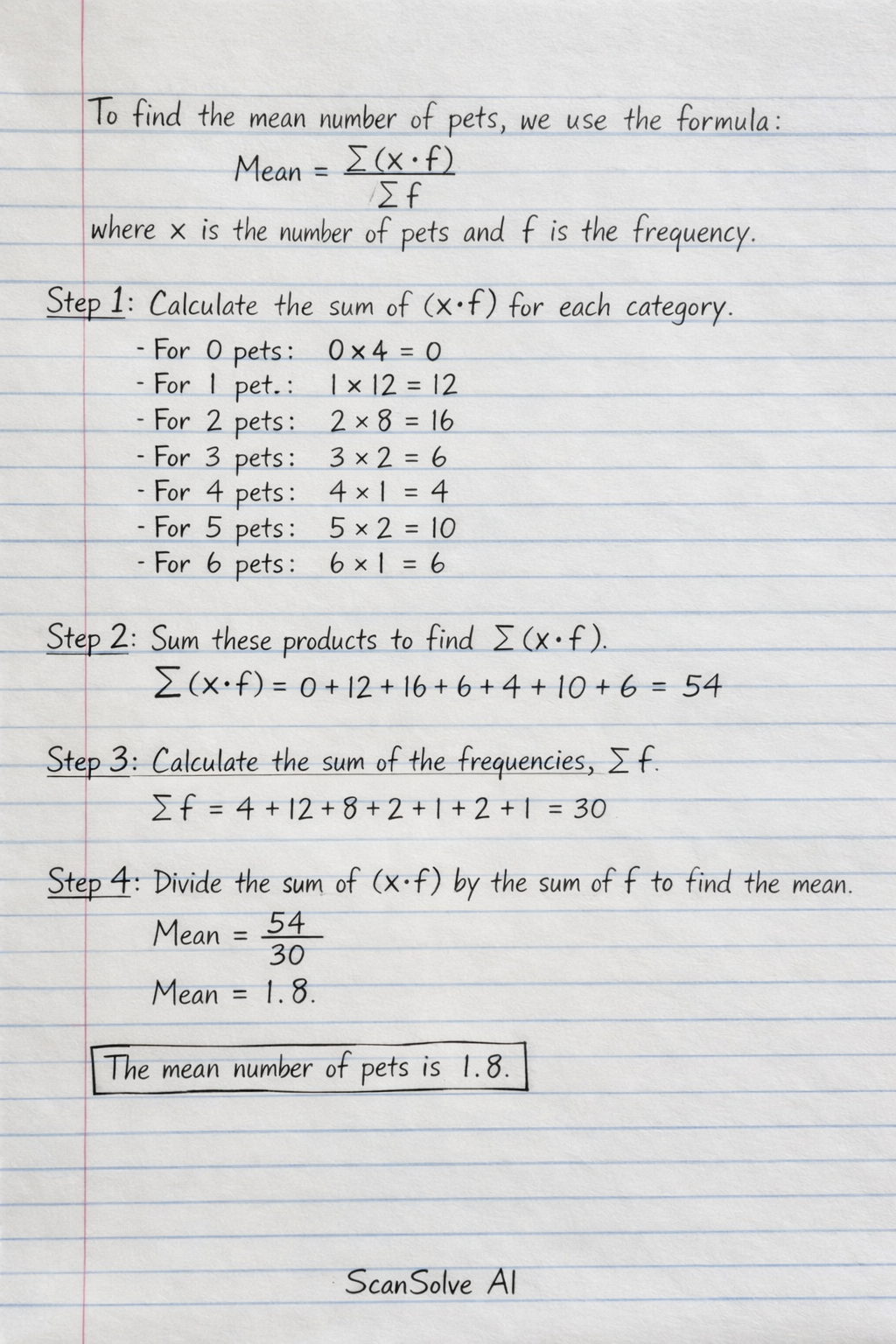 To find the mean number of pets, we use the formula for the mean of a frequency distribution: