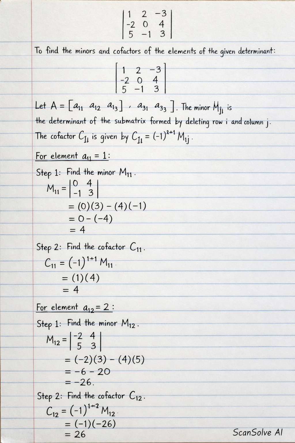 $$ C_{12} = (-1)^{1+2} M_{12} = (-1)(-26) = 26 $$