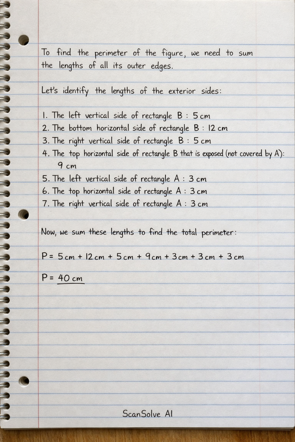 - The top horizontal side of rectangle B that is exposed (not covered by A): 9 cm