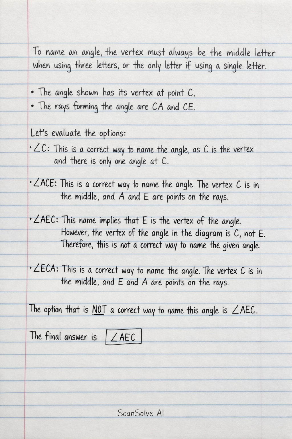 - ∠AEC: This name implies that E is the vertex of the angle. However, the vertex of the angle in the diagram is C, not E. Therefore, this is not a correct way to name the given angle.