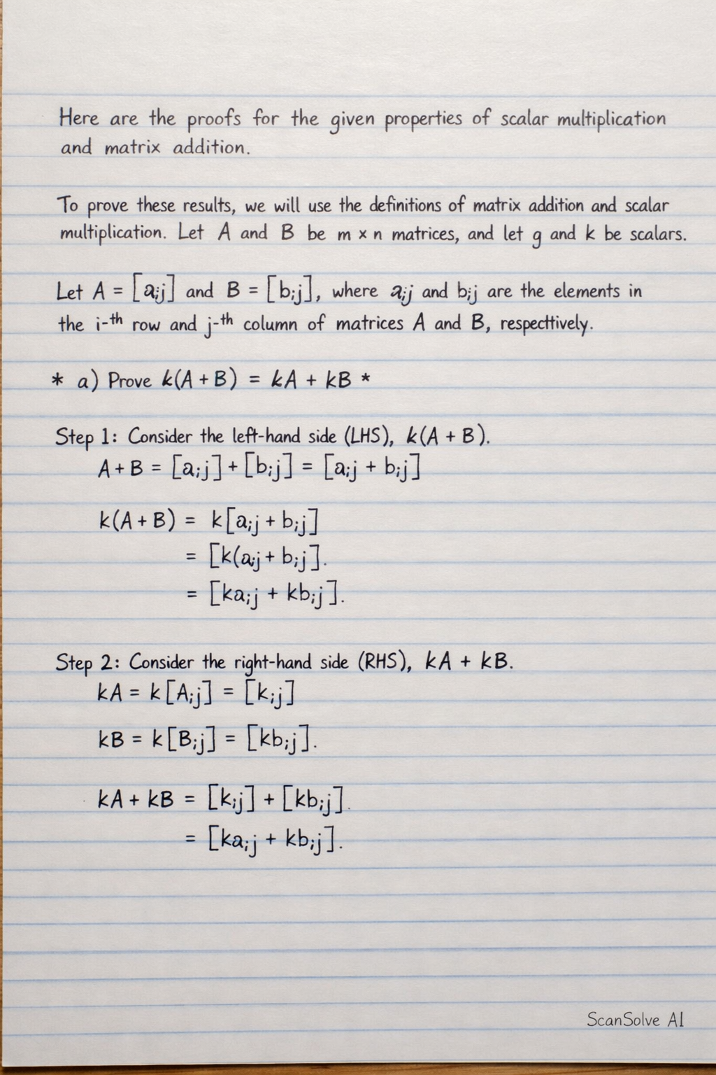 Using the distributive property of scalars over real numbers, k(aij+bij)=kaij+kbij.