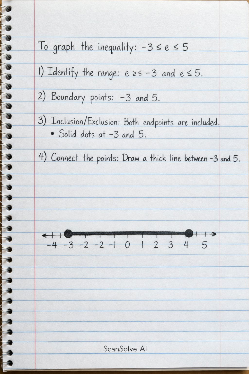 - Identify the range: The inequality states that e is greater than or equal to -3 and less than or equal to 5.