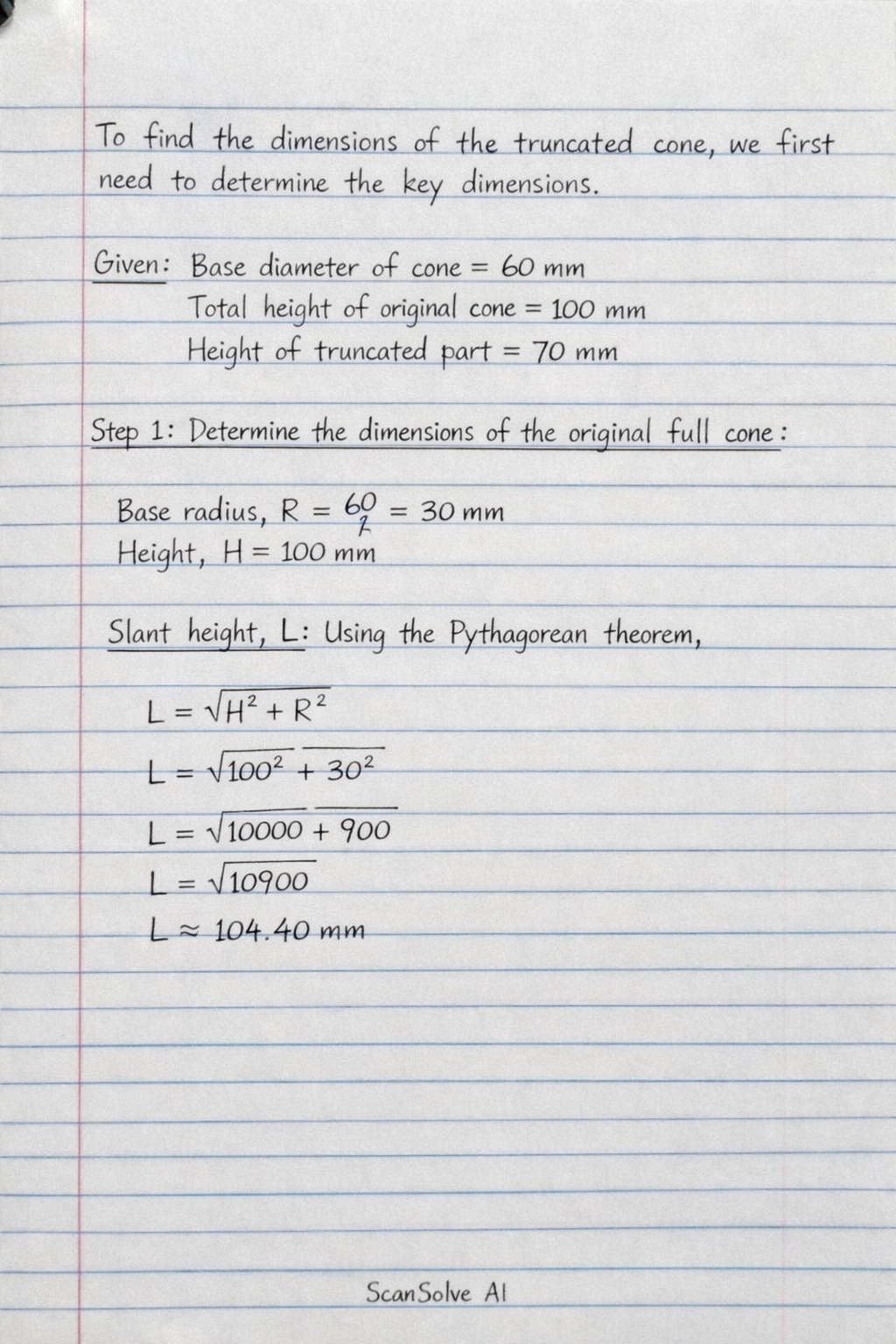 Slant height, L: Using the Pythagorean theorem,