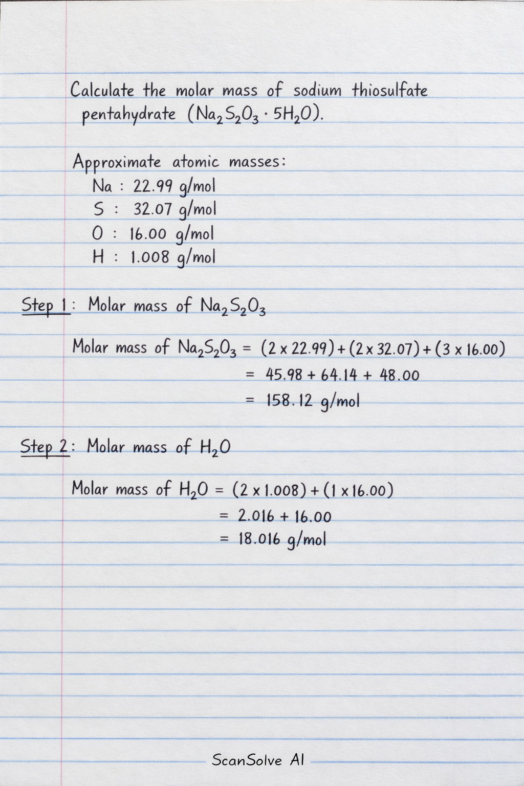 Step 4: Add the molar mass of Na2S2O3 and 5H2O to get the total molar mass of sodium thiosulfate pentahydrate.