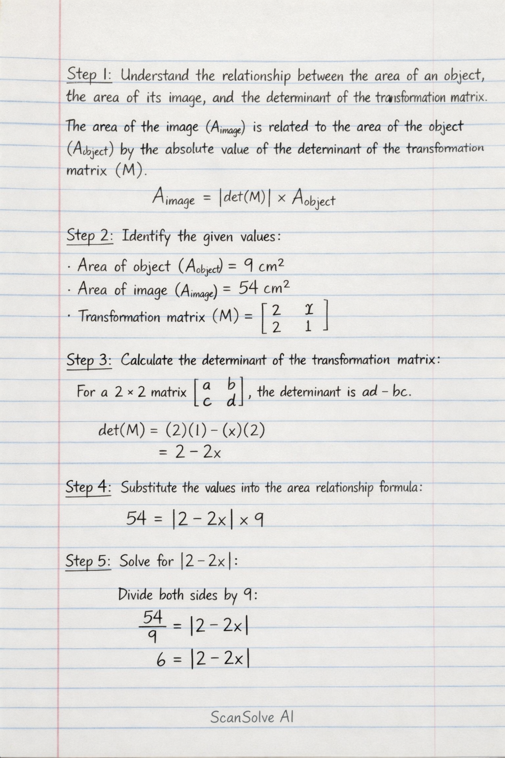 Step 1: Understand the relationship between the area of an object, the area of its image, and the determinant of the transformation matrix.