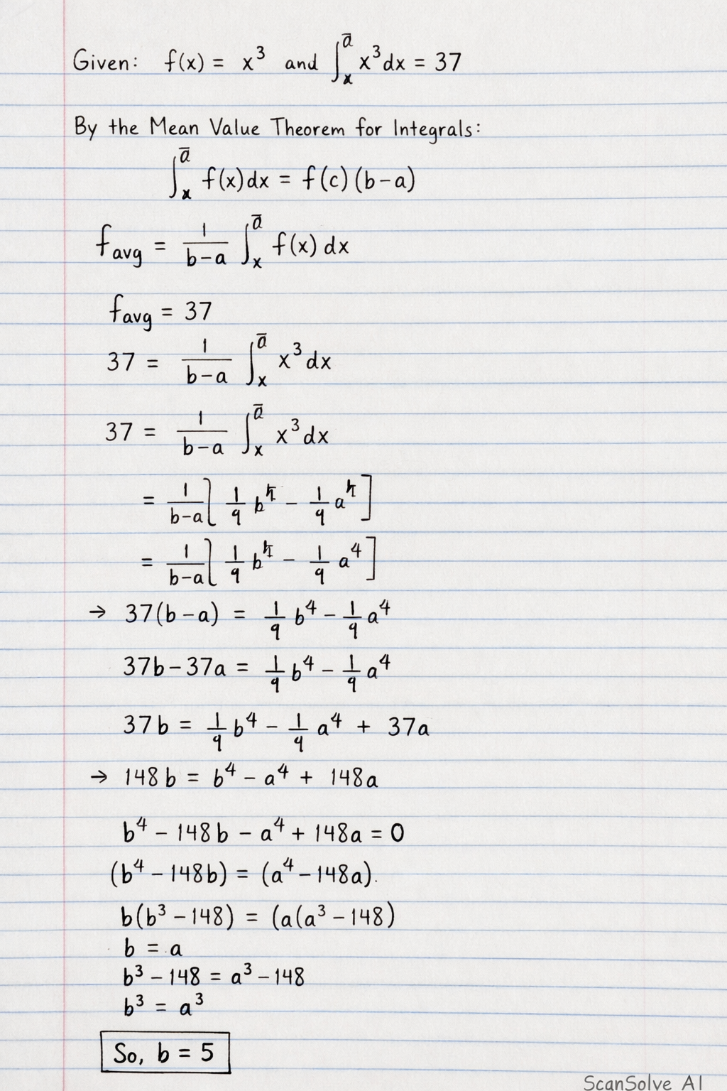 us to find the value of b given that f(x) = x^3 and the value resulting from the Mean Value Theorem for Integrals for integral_a^b f(x) \,dx is 37.